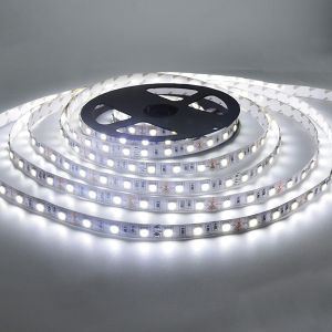 Стрічка з цілком простими характеристиками, але використовуються яскраві надійні світлодіоди типу SMD 5050, найкраще рішення для світлодіодних стрічок. Такі діоди здатні працювати близько 20 тис. годин при мінімальному споживанні електрики, на стрічку потрібна потужність до 14,4 Вт на метр вироби. До речі, продаємо даний товар у бабинах по 5 метрів, ціна формується за 1 метр вироби. Для зручності монтажу передбачені дві особливості: два дроти з кожної сторони вироби і клейка основа на поверхні. Основа закрита, тому видаливши захист можна наклеїти LED стрічку в вертикальному або горизонтальному положенні. Світлодіоди SMD 5050 давно показали свою ефективність рекламної та дизайнерської сферах, адже їх яскравість і наявність 60 діодів на метр дозволяє реалізувати всілякі задумки. Кут світіння на стандартному рівні — 120 градусів, нейтральний білий світ видає температуру від 6000 до 6500 К. Перед монтажем переконайтеся, що на стрічку буде подаватися безпечне напруга 12 В, від стандартної мережі виріб працювати не буде і просто згорить.